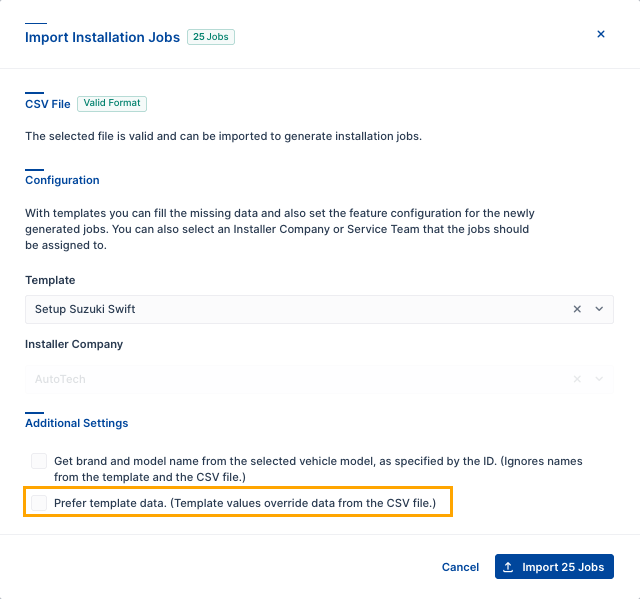- If your CSV and template have conflicting data (same field, different values), you’ll see the option “Prefer template data”.