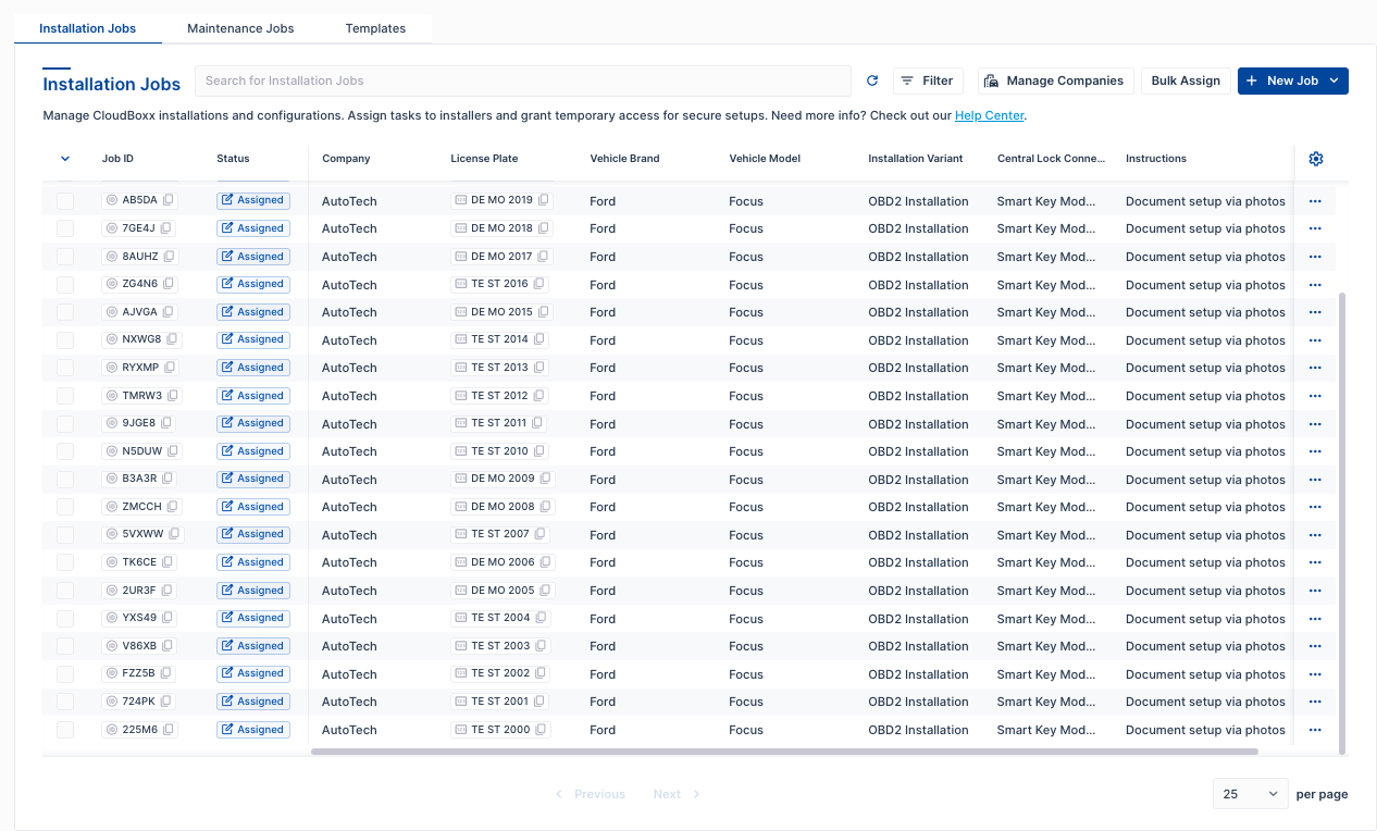 Quickly create 10, 100, or up to 1,000 installation jobs simultaneously by uploading a CSV file.