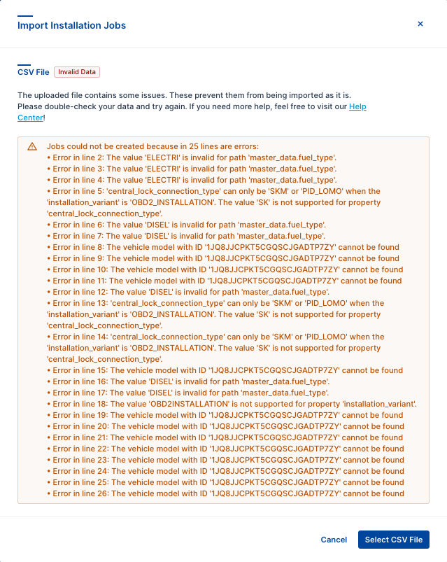 When validation fails, FleetControl shows which row caused the error and why. Correct the errors in your CSV file and import again.