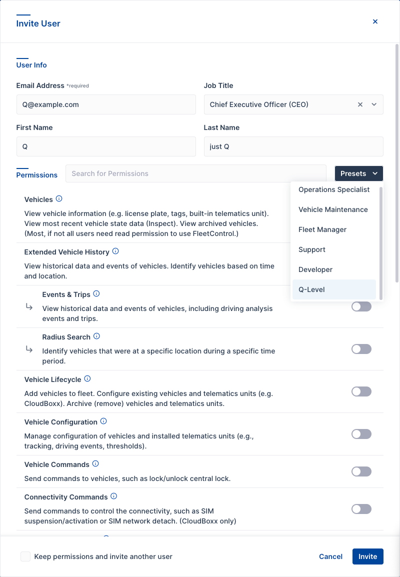 - Permission presets: Pre-configured roles (Developer, Fleet Manager, Operations Specialist, Support, Vehicle Maintenance)