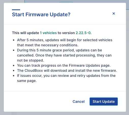 - Allow when driving enabled: Enables firmware updates to telematics units even when the vehicle is currently being driven.